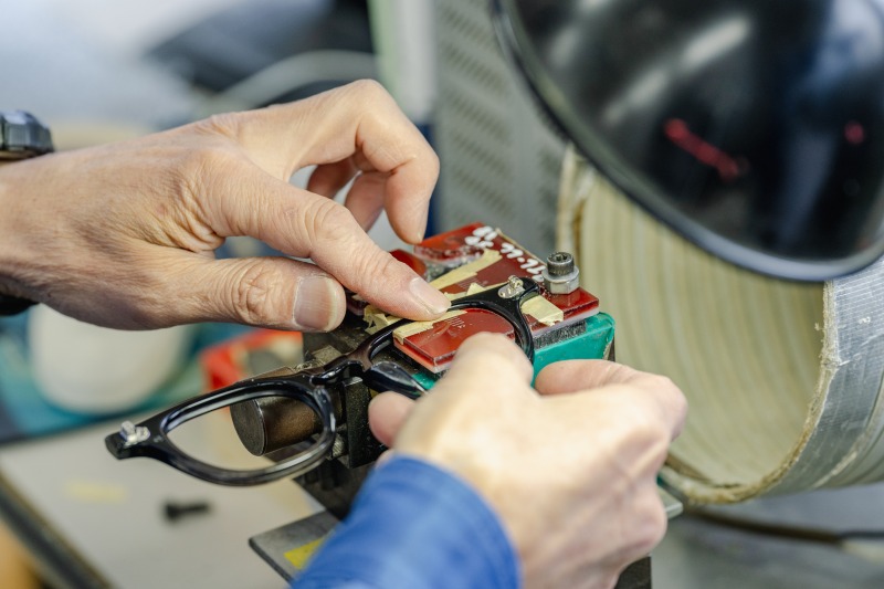 眼鏡のフレームづくりは工程の一つ一つには奥深さがあり、慎重かつ正確に作業を進めています。メーカーのデザインも毎年新しいものになり、要求される品質のレベルも高まってきます。高品質な製品を作り出すプロフェッショナルとしての自覚を持ち、自分たちもレベルアップできるやりがいのある職場です。生地がさまざまな工程を経て製品に仕上り、完成品を見られるのは魅力であり、質の高い商品を全社員で作り上げるという誇りを持てる仕事です。